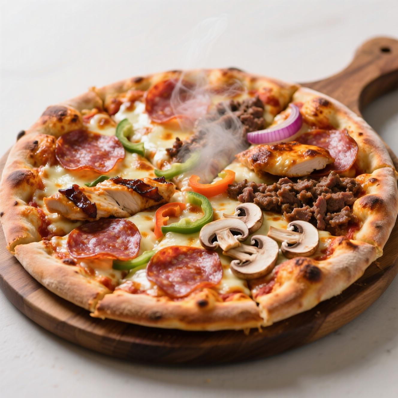 Bold and spicy American-style pizza topped with halal hot dog slices, pepperoni, onions, jalapenos, and chili flakes for a fiery, indulgent treat.