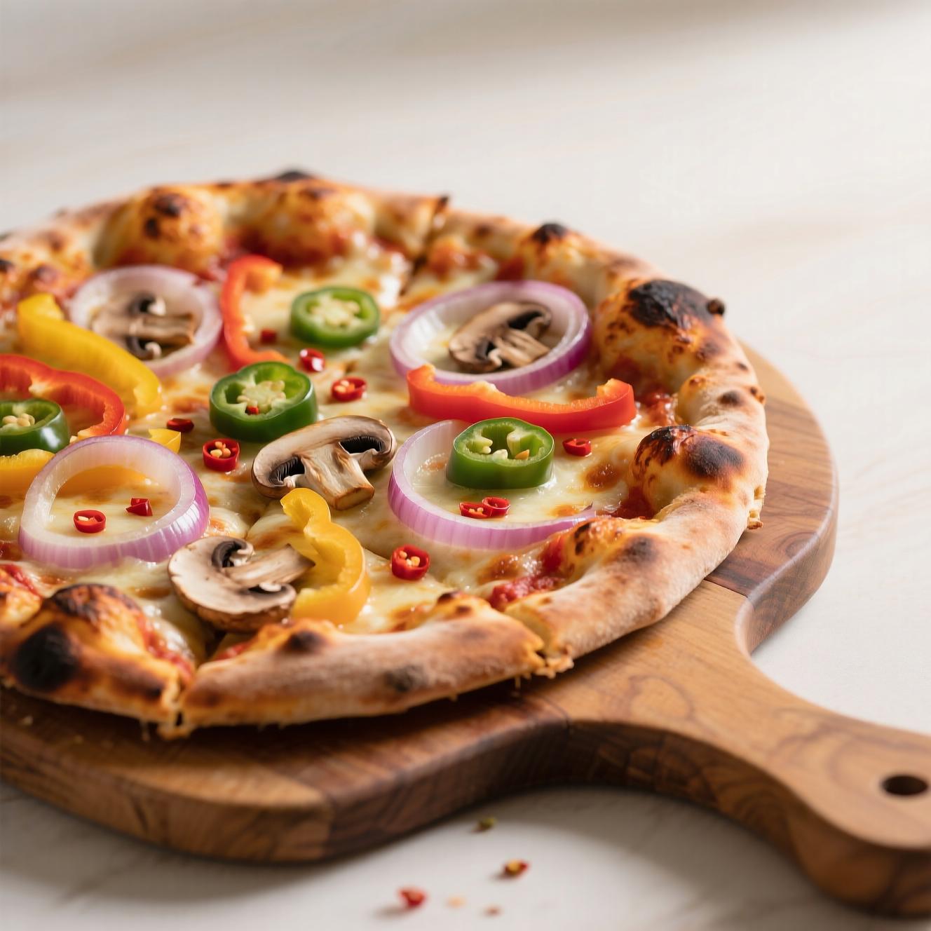 A hearty meat feast with halal pepperoni, BBQ chicken breast, minced beef, mushrooms, and onions, offering a satisfying mix of rich, savory flavors on every slice.